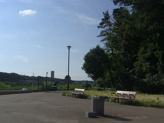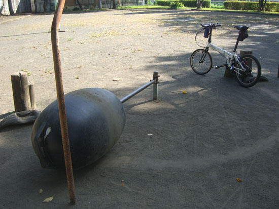 しかたないので公園外周をぐるっと回って再び休憩所前に戻る。ここで持参したあんパンを食べて帰ることにする。復路は追い風区間が多くやや楽だ。途中の木陰と水道のある公園(宮久保2号公園?)で5分ほど小休憩。何やら爆弾のような風変わりな遊具?が設置してある。