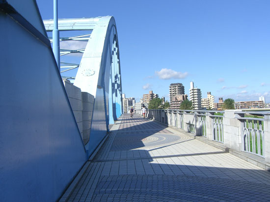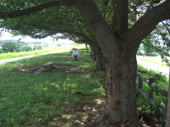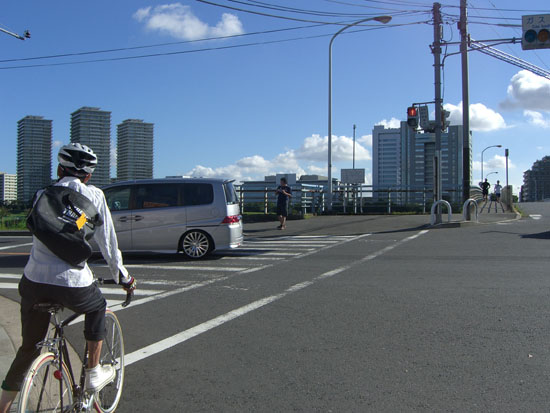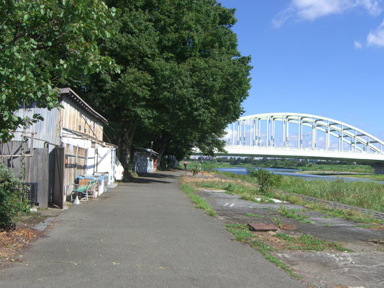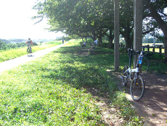 跨線橋を渡ってJR南武線平間駅前を通過しガス橋にでる。歩道は結構混雑していたので車道を走行して橋を渡る。ガス橋脇のトイレ前で小休憩。この辺りは木陰が続いていて夏場は助かる。