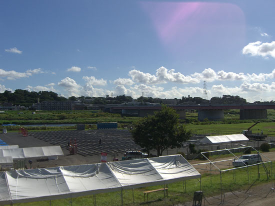 丸子橋で右岸に渡り多摩川サーキット跡地?の凸凹舗装を通過して等々力付近の休憩所で小休憩。第三京浜を過ぎたあたりの川原では昨日、花火大会があったらしく後片付けが行われていた。