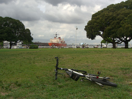 連日の猛暑から解放されて過ごしやすい気候となったが朝から雨が降ったり止んだりと不安定…。雨雲レーダーをチェックすると局地的に降っている模様。今回は午後2時半すぎから雨雲の間隙をついて出発。路面はまだ若干濡れている。とりあえず床屋&郵便局&図書館に借りていたものを返却ついでに久々に山下公園によってみる。大桟橋に南極観測船しらせ?が停泊していた。天候はいまいちだけど休日の午後とあって人出は多い。