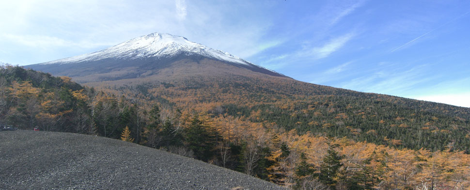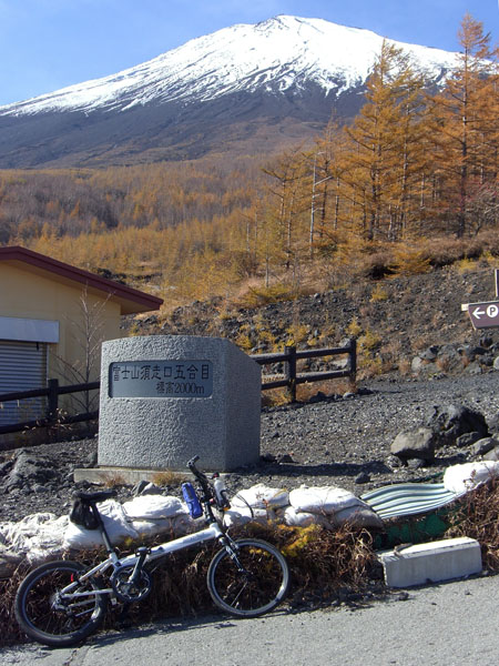 ひとのぼりしてちょっと開けた富士山への見晴らしの良い場所にでた(0950)。ここで自動車でやってきたひとにどこからきたのかとかどこまでいくのかなどと訊ねられる。ここまでですでに1時間を越えてしまっている…。この先からが本番のようだが…。富士山は依然として雲ひとつない青空を背景に聳えている。5分ほど小休憩して先へとすすむことにする。前方に見えていた急坂をのぼるとほどなく馬返しに到着(1000)。ここでやっと半分らしい。さっきの急坂の途中で脚がつりそうになったのでこの先は無理せずのんびりハイキング気分で押していくことにした。歩きながらメーターで速度を確認すると0~3Km…。残り5kmほどあるので1時間半以上かかりそう…。ほどなくグランドキャニオンという標柱の前に到着(1008)。自動車が止まっていて先ほど下で会った人達がハイキングの準備をしていた。道路脇にはところどころ黄色やオレンジ、赤などに紅葉している樹木がある。このあたりは押していてもつらくなるような斜度の連続だ。ようやく8kmの標識(1041)。ここまでですでに休憩込みで約2時間だ…。二合目、狩休の看板がありすぐ先にバス停がある(1044)。