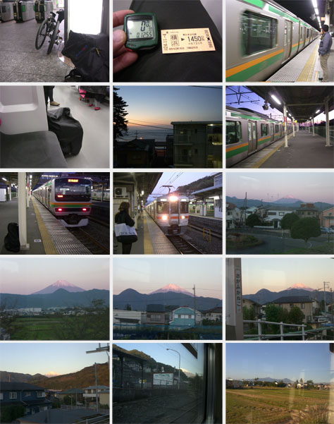 今回はちょっと無謀かと思ったが富士あざみラインをのぼって小富士までいってみた。午前4時すぎに出発。まだ外は暗い。横浜駅東口から中央通路に降りて改札口前まで自転車を押して行く(早朝で人が少ないので問題ない)。切符を購入して自転車を折り畳みカバーを被せてホームに向かおうとすると駅員さんが今始動点検中なので向かいの改札口へどうぞということなのでどっこいしょと自転車を担いでいく。ホームへ上がり5分ほどして4時54分発の熱海行東海道線に乗りこむ。ガタンゴトンと揺られて相模川を渡り大磯を過ぎたあたりから空が明らんできた。(JR東海道線車内放送 31s.)5時45分頃に国府津駅に到着。ホームに降りると建物と樹木の隙間からわずかに相模湾が見えた。ここで御殿場線に乗り換えるために隣のホームに移動。10分ほどして電車が到着したので車両に乗りこむ。自転車を手摺りに固定していると大磯からきたという人に話しかけられた。自分も自転車に乗っているということであれこれ話をする。車窓から朝日を浴びて赤みを帯びた富士山が綺麗に見えていた。やはり今日は天気予報通りに快晴のようだ。谷峨駅を過ぎてトンネルを抜け駿河小山駅に6時42分に到着。(JR御殿場線車内放送 25s.)御殿場駅には7時ちょうどに到着ということで約2時間の電車の旅となった。
