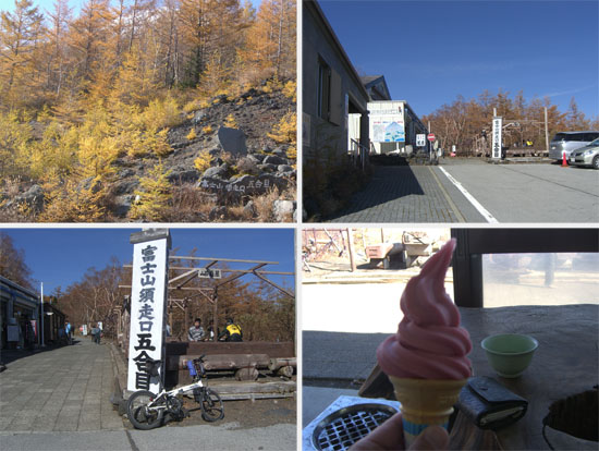 さらによたよたとのぼっていくと背の低いカーブミラーがある。道路脇にセシウムが検出されたとか毒キノコに注意という看板がある。ちょっと平坦基調になったり下ったりしているところは自転車に乗ってみる。三合目、四合目という看板前に到着(どっちなんだ)(1119)。そしてようやく10km標識前(1127)。樹林の間から下界が望めるようになってきた。11km標識前をすぎて緩い平坦基調の道を進んで右にカーブするとドーンと富士山五合目らしき場所にでた。時刻はちょうど正午近い…。結局休憩等込みで3時間超だったようだ。ちょっと予定よりかかりすぎたか…。
