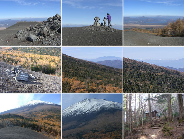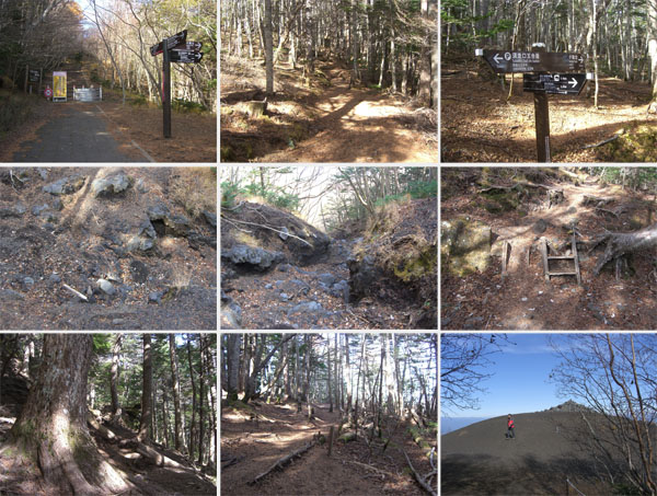 さて予定よりはだいぶ遅れたが本日の目的地の小富士に向かうことにする。山荘の奥へ歩いていくと頂上への登山道と小富士への遊歩道の分岐地点につきあたる。小富士(25分)と表示してある。登山道はすでに登山期間を過ぎているので閉鎖されている。右手の林の中へ入ると道は緩やかに下っていき岩場や沢跡を越えて小さなハシゴをのぼりすすんでいく。じき樹林帯を抜けて視界が開け前方に小山が見えた。山荘から20分程度かかったようだ(0042)。