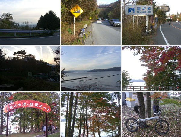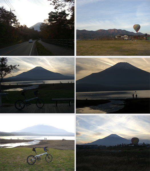 さて今回はもう充分目的も果たしたので右折して御殿場駅から輪行でも良かったが何とはなしに左折して籠坂峠へ向かってしまった…。マイペースで峠までのぼる。さすがに急坂なあざみラインと違いのぼりやすい。40分ほどで峠に到着(1547)。山中湖まで下るとだいぶ日が陰ってしまっていた(1600)。湖畔のトイレで用を足して遊歩道沿いを走行していくと夕焼けの渚・紅葉まつりが開催されていたがすでに日が暮れかけているので先へと急ぐことにする。まだ紅葉しはじめたばかりといった感じで今週末あたりが見頃そうだ。