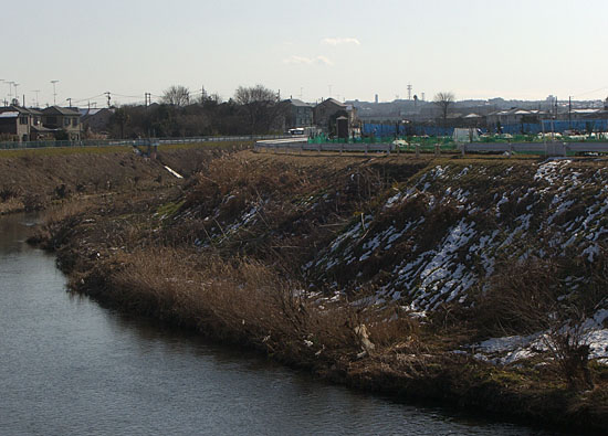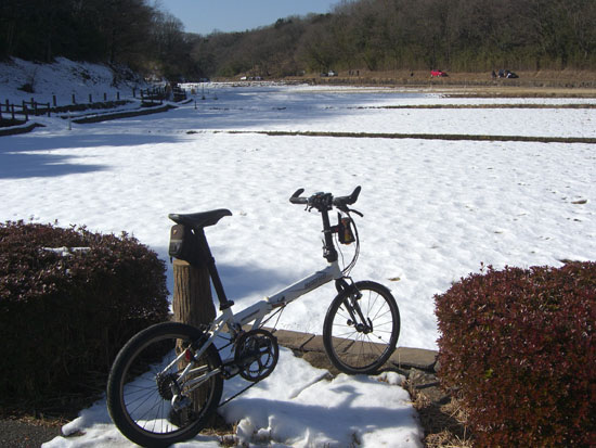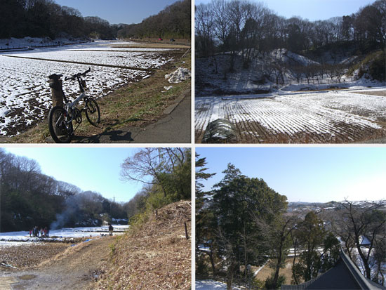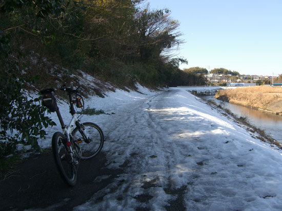 丹沢と富士山をのぞみながらのんびりと上流に向かう。左岸側はほとんど土手上の雪は解けていて走行に問題なかった。橋の下に一部残こっていた程度だ。ほどなく市ヶ尾高校裏に到着。まだ時間はありそうなので寺家ふるさと村までいってみることにする。少し戻って橋を渡り右岸を走行。こちらは日影になっている部分が数百メートルに渡り雪が残り凍ってしまっていた。自転車を押して足下に気をつけながら通過。