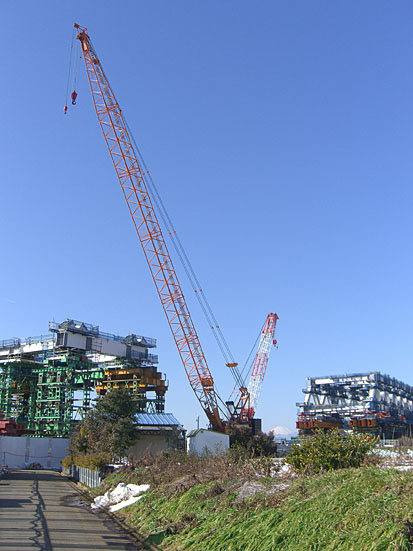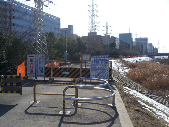スロープの手前はぬかるんでいたので足下に注意しながら通過し土手にあがる。大熊川との合流地点付近は自動車道の工事が行われていて道幅が狭くなっている。