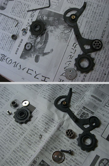 ディレーラー・プーリーにかなり汚れがこびりついていたので分解清掃してみることにする。数年一度くらいの頻度で拭きとりはしていたが分解するのは初めてだ。2箇所あるプーリーは六角のネジでそれぞれ止められていた。ちなみにディレーラーはSRAMの低グレード製品のものでケージは樹脂製だ。パーツを落とさないように慎重に取り出す。ベアリングは使われておらず注油する必要もなさそうなので汚れを拭きとり元通りに組み付けておく。約2万km走行後も汚れやスレ傷はあったがまだ使用可能そうだ。
