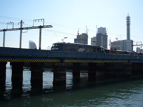 公園は細長く海(運河)に面しており正面に時折通り過ぎる貨物列車やみなとみらい地区が見渡せた。家族連れの親子がカモメに餌を与えて遊んでいた。