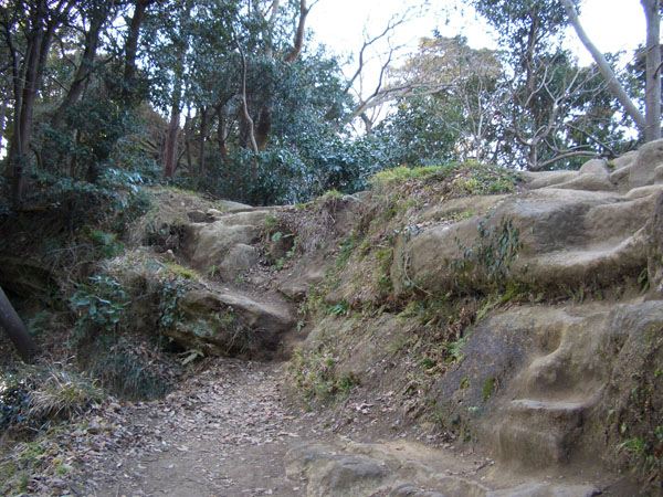 えっちらおっちらアップダウンのある尾根道を歩いていくと覚園寺への分岐点に到着。前回きたときはここで引き返したのだ。左へ行くと覚園寺、右の階段は今泉台の住宅地へと下っている。今回は建長寺方面へ直進する。