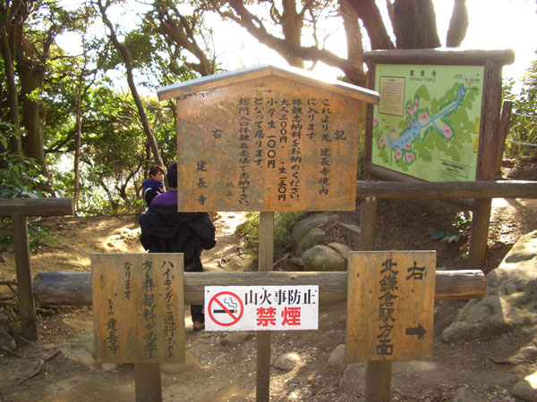 勝上けんの展望台に着く頃にはすでに午後3時を過ぎていた。下に行くと建長寺の敷地でここを通行する場合には拝観料として300円支払えとの立て札が立っていた。