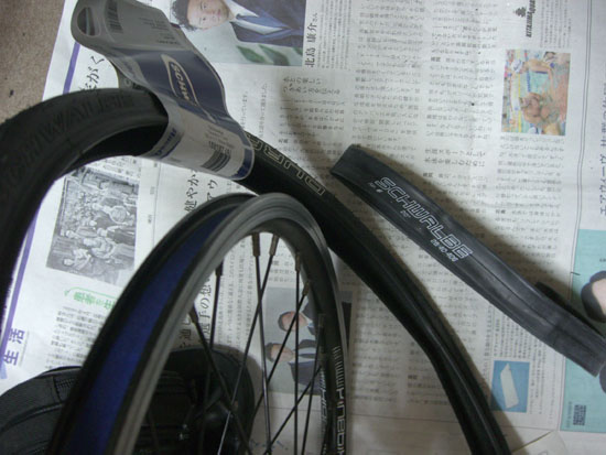 タイヤをリムにはめ込むのにやや苦戦…新しいせいかかなり固い。親指が痛くなったがなんとか装着完了。サイクルコンピューターのタイヤ周長は1,480mmとデュラノ用の設定になっていたのでそのままにしておく。