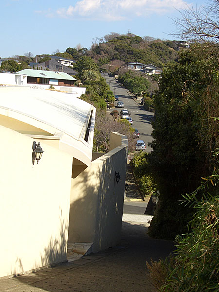 逗子駅手前の踏切を渡って駅前のなぎさ通りを抜けると池田通りという交差点にでた。ここで地図を確認、そのまま直進し久木郵便局を通過し小坪入口を左折する。披露山入口のバス停の先を左折するとぐねぐねとした急な上り坂となった。
