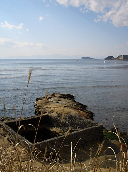 逗子マリーナを抜けて、飯島公園の海側に出るとここからも江の島と富士山が見えていた。更に先へと海沿いに進むと砲台のあとらしきものがあり、和賀江嶋を抜けると飯島トンネル前の高架をくぐってR134号線の右側の歩道に出ることができた。(手前を曲がれば左側の歩道だったのかも…)この辺りの歩道は変則的で少々走りにくいようだなどと考えいるうちに滑川に到着してしまった。