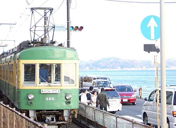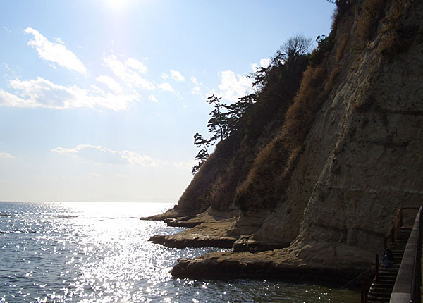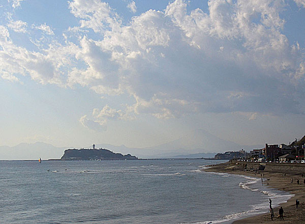 鎌倉高校前駅の踏切を渡り坂道を上って振り返ると踏切越しに相模湾が輝いていた。駅前に戻り何台か江ノ電が通過するのを眺めた後に七里ヶ浜に降りてみる。波打ち際でしばらくぼんやりと波の満ち引きを眺める。遠くに伊豆大島が霞んでみえていた。