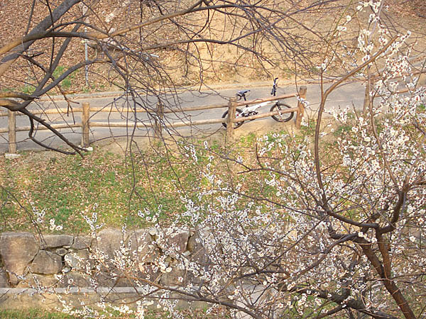 次に鶴見川沿いの新田緑道を走行してみる。所々に工作機械らしき廃品がオブジェとして飾られていた。ここでも数本の梅が咲いていた。