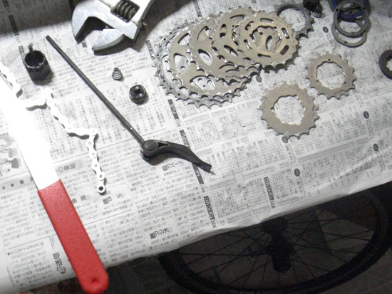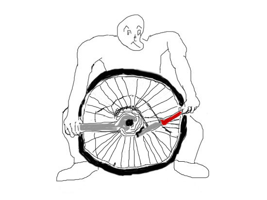 チェーンはKMCのミッシングリンクで繋いであるものなので取り外せるはずだがやや苦戦…オイルと泥で固着したか…5分ほどで無事外せた。前回取り外して清掃したのは今年の1月下旬でほぼ1年ぶり、現在約26,319kmということで約2,219kmぶりに清掃&注油ということになった(この間に数回注油のみはしていたが…)。今回はスプロケットも取り外して掃除。久々の作業だったのスプロケットの取り外しに手間取ってしまった。クイックレバーを抜いてロックリング抜き工具を装着し右手にモンキーレンチ、左手に取り外し工具を持ち工具のチェーンをスプロケット上部に掛け固定してモンキーレンチを押し下げる。言葉で書くと難しいので以下の図に描いてみた。フロントのチェーンリグは取り外さずに適当に拭くだけにしておく…。
