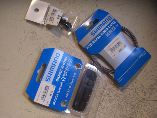ブレーキ・インナーワイヤーは“Shimano MTB SUS Brake Inner Cable”というステンレス製のもので(ブレーキレバーに付属していたものはスチール製?)ブレーキシューは200円台の激安のものなどいろいろと種類があったが無難そうなシマノ製品“M70CT4 Severe”を購入。さらにブレーキの間のケーブルに通してあるジャバラ状のもの(ブレーキブーツというらしい)も購入しておく。店員さんによると雨水や泥などが入り込まないようにするものなので装着してなくても良いとのことだがとりあえず購入しておくことにした。価格は1ヶ200円とぼったくり価格のような…せめて2ヶ入りにしてほしいな。