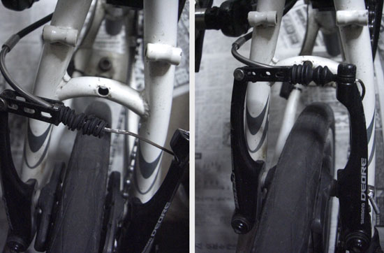 前回の走行前にフロントブレーキケーブルのほつれを発見。ブレーキブーツに引っかかって時々ブレーキが正常な位置に戻らない状態になってしまっていたので購入したインナーケーブルと交換した。記録を見ると2014年の3月下旬にブレーキレバー交換時から使用しているので約2年弱保ったようだ(約4,500km)。後輪の方はまだ大丈夫そうだなと眺めてみるとVブレーキのケーブルを止めるネジのガイド(押さえる板)の向きが前輪と違うことに気づいた…前輪側は2年弱反対の状態だったので擦れてほつれてしまったのかな? それともたまたま今回逆につけてしまったのか…。付属していたものはグレードの低いスチール製のものだったようでそれほど耐久性はないのかもしれない。ということで前輪の方を付け替えて後輪に購入したブレーキブーツを装着。今回はケーブルにシリコンスプレーを噴霧してみた。後輪ブレーキに比べかなり引きが軽くなった。さらにブレーキシューも交換しようと思ったがまだ半年~1年くらいはいけそうだ。後輪のほうはカートリッジではないタイプだがこちらのほうがそろそろ替え時だった…。ついでにフロントタイヤ側のクイックレバー、ハンドル、シートポストのクランプを清掃しグリスアップしておく。フレーム中央部の折り畳みレバー部も分解清掃しようかと思ったが今回はやめておく…。さらにアウターケーブルの一部にひび割れがあったのでビニールテープを巻いて補修しておく。そのうちに交換しないといけないな…。
