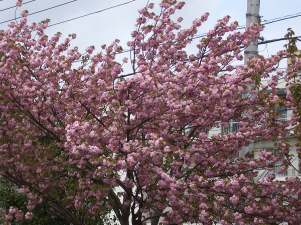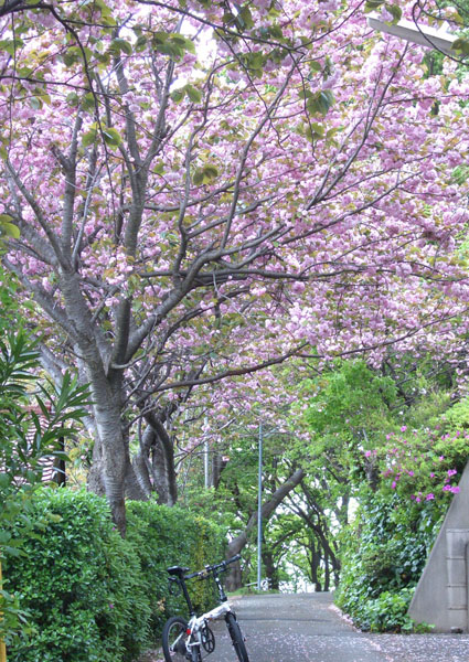 まず、菊名の隠れた桜(八重桜)の名所?、桜山公園(カーボン山)に行ってみた。旧綱島街道を妙蓮寺方面から東横線の踏切を渡って富士塚のバス停近辺から右側の細い住宅地の間の路地をしばらく上っていき左折するとああ、あった。ピンク色の八重桜がまだなんとか散らずに咲いていた。