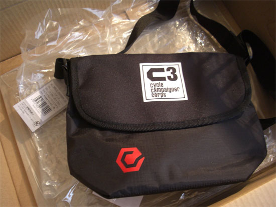 夏場にバッグを身につけてそこそこの距離を走るのは辛いので“サイクルキャンペイナーコープス C3 SHOULDER-S-”というフロントバッグを購入してみた。サイズはH25cm×W25cm×D10cmでナイロン/ポリエステル製、重量は140gと軽い。500mlペットボトルが5本ほど入る容量らしい。バッグ背面上部の2ヵ所にベルクロテープが縫い付けてありハンドルなどに固定し下部にはベルト通しがついていて縦パイプ等に固定できるようになっている。さらにショルダーバッグ用のベルトもついているので自転車から離れて持ち歩く時には活躍しそうだ(ショルダーベルトやベルクロテープは取り外せないので若干邪魔に感じそうだが…)。デザインなど細かな所に不満はあるもののコストパフォーマンスは良いんじゃないかな。