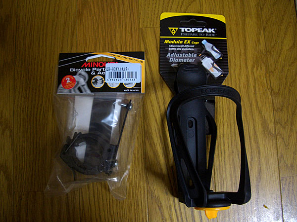 自転車ツーリング時には必須の水分補給であるが、DAHON Speed 2005にはボトルケージ用のネジ穴がついていない。今まではバックパックに積んでおいたものを休憩中に飲むぐらいだったが、これからの季節、やはりストレスなく停車時もしくは走行中にも飲みたいということでミノウラのQB-90というワンタッチ式でハンドル等に取り付けられるものとTopeak(トピーク)のモジュラケージEXという樹脂製の安価なものを購入してみた。