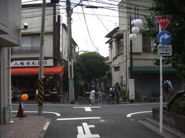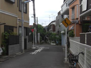 丁字路につきあたり左手の中杉通りを横断して一本右手の路地を進む。