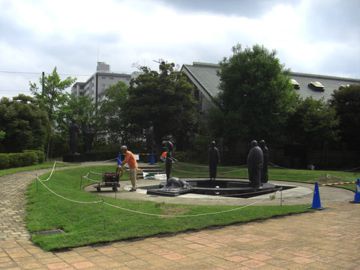 哲学堂公園内に入ってみた。自転車は乗り入れ禁止なので押し歩きで川沿いを進むと増水時に使用される調節池が見えた。
