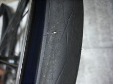 先週の日曜日に走行後は何ともなかったのだが夜にプシューと大きな音がしたので確認してみると後輪の空気が抜けてしまっていた…。そのまま放置しておいたのだがパンク修理することにする(今年は初めて)。タイヤのサイドに5mmほどの大きな亀裂がある…これはタイヤ交換しないといけないな…出先でなくて良かった。