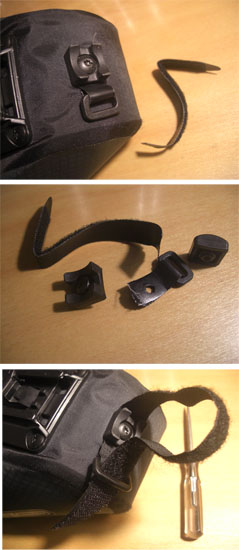 オルトリーブ(ORTLIEB)のサドルバッグLに荷物を詰め込み過ぎたせいかシートポストに固定するストラップが重みや震動でアダプタから外れてシートポストにぶらさがり耐えきれずにちぎれてしまったようだ…。ちぎれた部分を観察してみるとネジ止めのアダプタで挟んで固定してあるだけのようだ。ネジをマイナスドライバーで取り外し100円ショップで以前購入したもので代用できそうなものがあったのでとりあえずネジの通る部分に穴を開けて取り替えてみた。若干太くて(2cm、元のは1.5cm幅)数cm長くぴったりではないがとりあえず固定できるようになった。次回重量物を運ぶ時は補助バンドなどを使ってしっかりサドルレールに固定しないといけないな…。ちなみに今回は2.5kg程度で閉じ口一巻き半ぐらいだったかな。