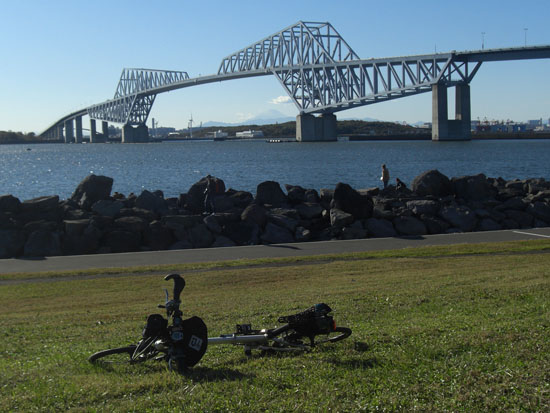 国道ルート-六郷橋-新八ツ山橋-品川駅前-芝5(日比谷通りへ)-芝公園-日比谷公園-祝田橋-皇居前広場-内堀通り-平川門-白山通り-神保町-水道橋-春日町(R246へ右折)-真砂坂上-壱岐坂通り-壱岐坂上(R17へ)-サッカーミュージアム入口(二差路左へ)-蔵前橋通り-外神田5-蔵前橋(隅田川横断)-天神橋-亀戸天神入口-江東新橋(旧中川横断)-平井大橋(荒川横断)-巽(たつみ)橋-新小岩駅北口-平和橋通り-八蔵橋-東小松川(船堀街道)-船堀橋東詰-船堀駅前-宇喜田橋-清新一中北-わかくさ公園前-荒川左岸沿いへ-葛西臨海公園-荒川河口橋-夢の島緑道公園-新木場緑道公園-東京ヘリポート前-若洲橋-若洲海浜公園-若洲橋-東千石橋北?-新木場駅前-新曙橋(渡り2つ目の信号右折)-辰巳(湾岸道路横断)-辰巳の森海浜公園前-七枝橋-八枝橋-消防所前・汐枝橋手前信号左折-丁字路右折し次の信号左折-白鷺橋-朝凪橋(豊洲ツインタワー前)-豊洲駅前-晴海大橋南詰-晴海大橋-黎明橋-勝どき駅前-勝どき橋-築地四丁目-三原橋-蓬菜(ほうらい)橋-新橋(R15横断)-西新橋(日比谷通りへ)-芝5丁目--JR高架下トンネル-田町駅東入口-三田警察署前-マンション敷地内-品川駅東口-丁字路右折し八ツ山通りへ左折-鮫洲公園前右折-旧東海道-鈴ヶ森近辺(R15横断)-桜新道・沢田通り-沢田(環七横断し左手の路地へ)-椿神社前-梅屋敷公園横(R15横断)-清水橋(呑川渡る)-日の出通り交番前(環八横断)-七辻(左手先の道へ左折)-多摩川左岸沿い-六郷水門-六郷橋(R15へ)-国道ルート