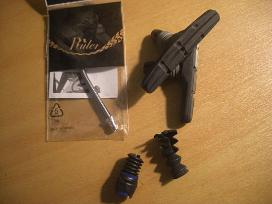 リヤのブレーキシューを交換(“ALLIGATOR(アリゲーター) Vブレーキ用ブレーキシュー ナット付 VB-620 ブラック”というブレーキシュー)。ブレーキ・インナーワイヤーは “Ruler(ルーラー) スリックステンレス インナーケーブル ブレーキ用 シルバー LY-BSTSK17”というステンレス製に交換。