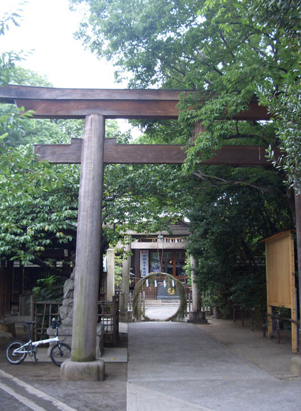 品川区民公園の入口を過ぎると商店街の中を走行するようになり目黒川の脇の荏原神社の鳥居が目を引いたので少し立ち寄ってみる。