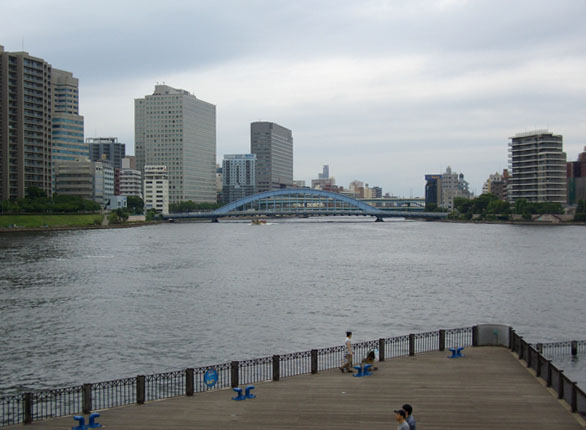 隅田川大橋を抜けて永代橋をくぐりぬけ永代公園、越中島公園と走行しさらに相生橋を渡り石川島公園、佃公園に到着。