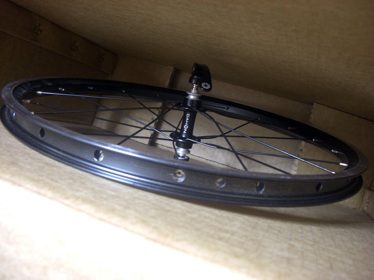 先日の走行でフロントホイールのリムが割れてしまったのでどうしようかと思いネットショッピングなどで検索していたらヨドバシ.comに“ダホン DAHON for Speed D8.Mu D8 20×20H Wheel Set FRONT”というものが取り寄せ品として売っていたので購入してみた。併せて破裂してしまったタイヤチューブも購入。D8というのはなんの略称なのかな? durable(耐久性のある)かな? P8に装着しても問題はなさそうではあるが…とりあえずこれで復活できそうだ。