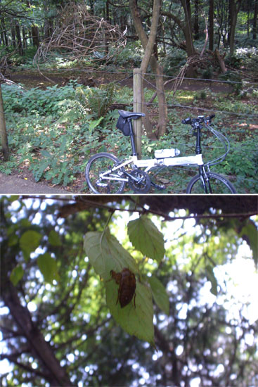 警備員に中原街道へでたいのだがと訪ねるとこの道は自転車は通行禁止なので引き返してといわれてしまった。仕方なく階段を自転車を担いで下ると大きな駐車場にでた。どうやらなんとか出られそうと思いほっとした。駐車場脇から横浜の森美術展という矢印に沿って再び森に入ってみる。適当に進んでいくと大きな谷戸にでた。