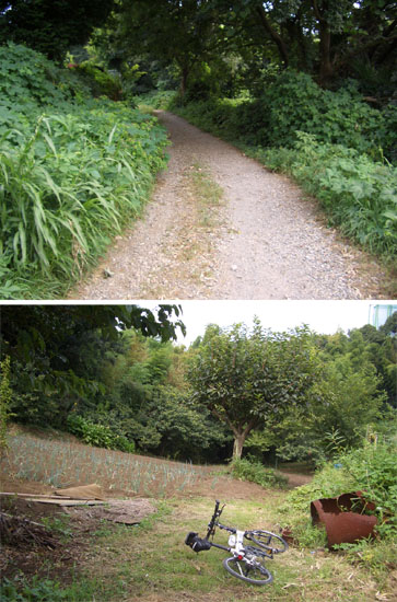 尾根みちを自転車を押してのぼって行く。とまると蚊がまとまわりつくので速歩でどんどんと先へいくことにした。結構鬱蒼とした森だ。鳥や蝉の鳴き声を聴きながら進んでいく。いくつかの休憩所をすぎて通りに面した分岐点にでる。尾根みちはさらに右折して通り沿いに続いていたが今回はここで離脱して若葉台方面に下ることにした。