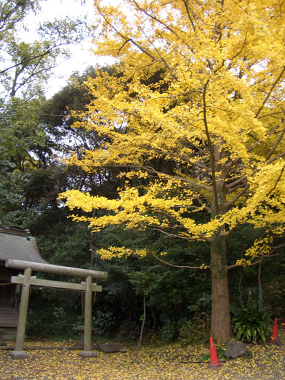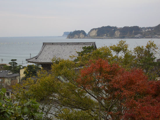 見事に黄葉している銀杏の木の脇を抜けて階段を少しのぼると行き止まりとなっていたが脇から上へ抜けてみると稲村ガ崎とその向こうに江ノ島が見えていた。