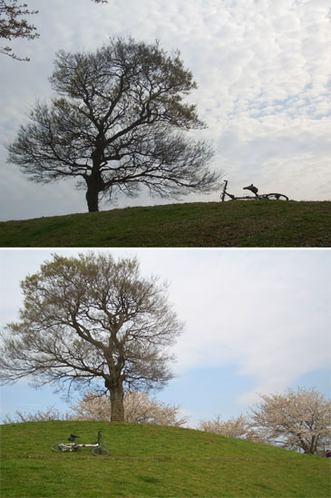 トンネルを抜けてすぐ左手のスロープをのぼっていくと大きな広場にでた。多くの子どもや大人が思い思いにはしゃぎまわって遊んでいる。さらにスロープをのぼりプール前を通過して高速道路上の橋を渡ると何やら手旗信号の旗を振る練習をしている一団がいる。前方の丘の上には一本ぽつんと木が立っているのが印象的だ。桜の木も数は少ないがいくらかあった。自転車を押して丘の上までのぼってみると展望が開けていた。南側なので上大岡、磯子方面あたりだろうか。