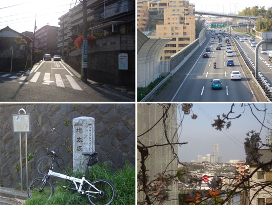 ここから先もまだだらだらとのぼっていく。境木中学校あたりで大通りに合流し右折すると見覚えのある境木地蔵尊前にでた。ここには武相国境之木の碑が建っていた。武蔵の国と相模の国の境ということだ。ここを直進すると先日上ってきた東戸塚駅方面、今回は左折して細い道を下って上り下ってとアップダウンを繰りかえして品濃一里塚前に到着。上が公園になっているようなのでのぼってみると親子連れと、ラジコンで遊んでいる少年がいた。奥には小規模な市民菜園のようなものがあり菜の花が植えられていた。引き返して再び旧東海道沿いをすすんでいくとほどなく品濃坂という案内板がある。丸舗装の急坂を下る。ぼんやりと大山の頭が見えている。晴れて空気が澄んでいれば富士山も見えるのだろう。ここからは陸橋で環状2号線を渡るようだが向こう側の階段にはスロープがないようなので自転車は担いで降りなければならないようだ(自転車の場合は環状2号線まで下って環2平戸の信号を渡ればよさそう)。