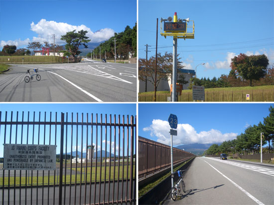 隣は陸上自衛隊滝ヶ原駐屯地だ。このあたりまでは緩やかなのぼりでそれほど苦もなく走行できた。左手に米軍海兵隊の施設キャンプ富士がある。道端の電光掲示には射撃中と表示されている。演習場で射撃訓練中ということだろうか…。