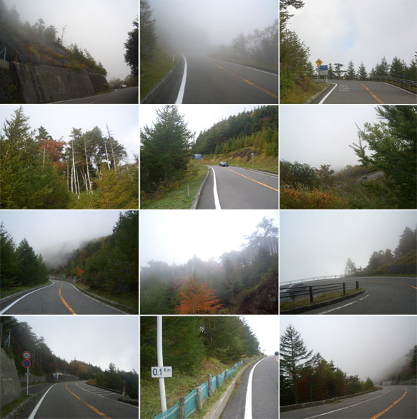 ほどなく七曲り駐車場(標高1,900m)に到着(1400)。このあたりまでくるとずいぶんとのぼったな感がある。三合目(標高2,000m)を通過(1414)。あと4kmの標識あたりから霧が深くなってきた。あと2km地点の看板あたりで道路工事の車両が停車していたが問題なく通れるようだ。四合目(標高2,300m)を通過(1448)。あと少しだ。