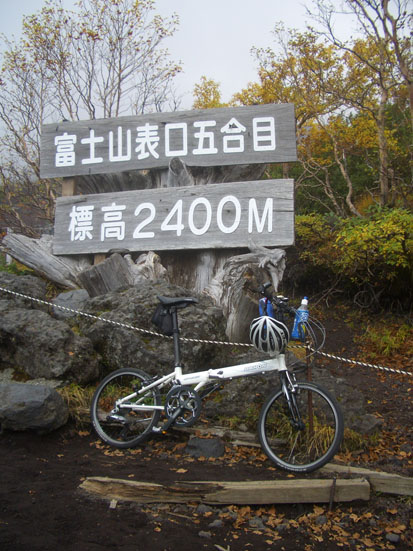 さらにひと頑張りすると新五合目駐車場に到着した(1510)。富士山は残念ながら雲の中…。下界も見えず…。とりあえず展望台までのぼる。奥にある階段へ自転車を担いで登山口標識前で記念撮影。30分ほどうろうろしたりして下山することにした。