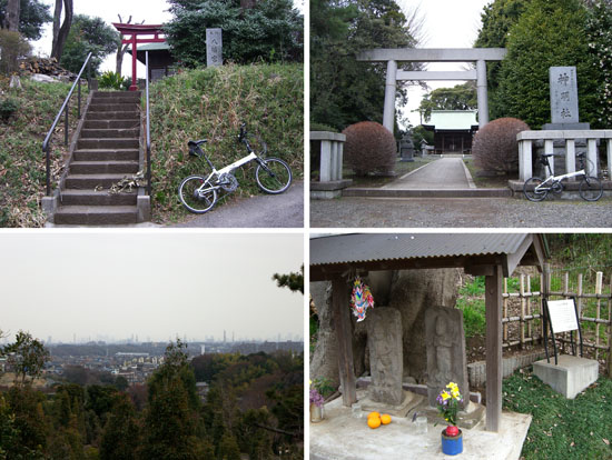 十三塚橋で第三京浜を渡り左手にある畑の中の道を下ってみる。うろうろしていると小さな神社がある。奉納八幡宮という石碑がたっていた。急坂をのんびりと押し上がり尾根道までのぼる。そのまま下ると鳥山郵便局前にでた。時計を見るとまだ時間はあるので以前に走行した区界の道で四季の森方面まで行ってみることにする。坂道をのぼり返して途中神明神社でお参り。農業専用地区を抜け区界の道へでる。右手側が時々開けていて東京スカイツリーや新宿副都心などがうっすらと見えている。墓地前の複雑な交差点にでる。とりあえず直進してみるがちょっと違うようだということで交差点まで引き返し上り坂の道へ進む。すぐ下りとなりカーブの途中に庚申塔がある(辻山の庚申塔という案内板がある)。