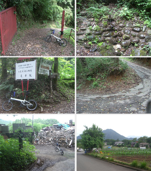 先のほうに階段があるが自転車じゃちょっと辛そうなので門をくぐって林道っぽい未舗装路を降りていく。結構急傾斜だ。赤い門扉が現れさらに下ると湧き水ポイントがあった。さらに下っていくと分岐地点にでた。関東ふれあいの道、城山高校前バス停2.4km、峰の薬師0.6kmとある。さらに急坂を自転車を押しながらくだっていくと前方にゴミ集積所が見えてきた(1530)。ここから先は舗装された道となる。指導標がたっていて峰の薬師0.9km、上中沢バス停0.6km・城山高校前バス停2.0kmとなっている。ここまで降りてきてちょっとほっとしていると下から大宮ナンバーの乗用車が上がってきてハイキングコースへとのぼっていった。無事だっただろうか…。しばらく下ると前方に城山がみえてきて里山の風景となった。さらにくだって津久井湖北岸の道路に合流する(1536)。