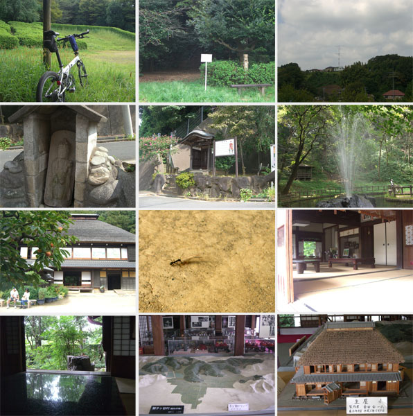 入口の急坂を少しのぼって灰ヶ久保広場というところで小休憩。ちょっと薄曇りになってきたが暑い。9月半ばすぎだが蝉もまだ鳴いている。先ほどいたアンテナのある家が丘の上に見えている。10分ほど休憩して公園沿いの道にでて西谷広場にむかってみることにする。広場にはちょっと大きめの池があり噴水が涼しげに吹き出している。池の周囲を回って出発。横溝屋敷前にでると門が開いていたので寄ってみる。古民家は中に上がれるようになっていた。2階もあり急な階段をのぼると村の模型などの展示があった。時計を見ると10時半すぎ、あまりのんびりしていると遅くなるので主屋だけ見学して出発。
