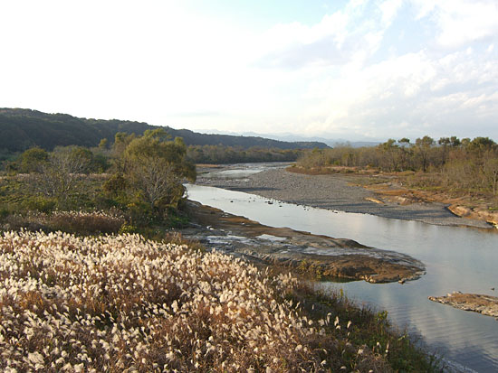 貝殻橋を渡るとなぜかベンチの上ににわとりさんがいた。立日橋をくぐりぬけ中央線をくぐると気持ち良い区間。前方に多摩大橋が見えてきた。すすきが風になびいてる。奥多摩?の山並みも見えてきた。拝島橋手前でもすすきが陽に照らされて綺麗。時刻ももうすぐ3時になりそうなのでそろそろ引き返さなくてはならないがせっかっくここまできたのだからちょっと寄り道ということで橋を渡って対岸にいってみる。