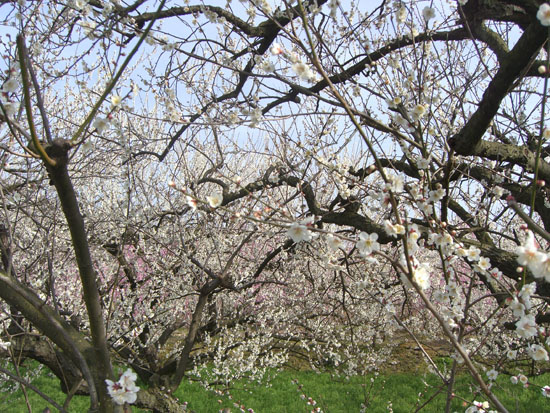 岡入口の信号で呼吸を整える。釣具屋さんの奥のほうにトンネルが見えている。トンネル(東海道線高架下)を抜けると神社前にでた。国道とはうってかわって静かでほっとするがほどなくガソリンスタンド先で県道と合流する。民家の庭先の梅も見頃といった感じでなかなか綺麗。小さな丘をひとつ越えると梅林の入口らしき場所にでた(1452)。曽我別所梅林信号の脇に案内板がある。脇の道をのぞいてみると梅林らしきものが見えたのでいってみることにする。天気も良く青空に箱根の山並をバックにたくさんの梅の花が満開ということでなかなか綺麗。