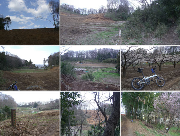 丘陵が工事で削られていて遠くには東京都心のビル群なども見えている。反対側を見ると里山の風景が広がっている。ここで行き止まりのような感じなので里山方面の崖を下って降りることにする。滑らないように注意してじぐざぐに降りていくと先ほど上から見えた畑地横に降りてこられた。ちょうど梅の花が満開で綺麗だ。トラクターで畑を耕しているのが見える。脇に多摩都市計画生産緑地地区という柱がたっている。ということはこのあたりは住宅が造成されることはないのだろう。