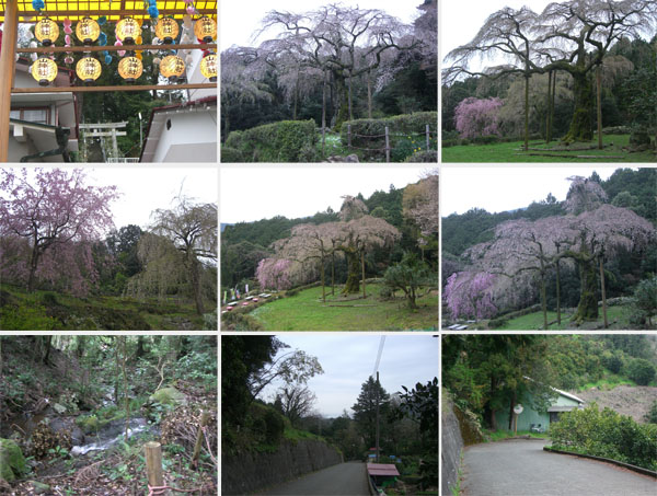 国道を横断して入生田駅横を抜け紹大寺の枝垂れ桜方面に向かう右折すると民家の奥に鳥居が見えた。提灯が灯っていて奥から賑やかな声が聞こえてくる。お祭りのようだ。急坂をのぼっていくと分岐地点にでた。ちょっと迷いつつうろうろして通りかかった人に道を尋ねると直進していけばよいとのこと。とりあえず自転車は小屋の横に置いて急坂をのぼっていくとほどなく紹大寺の枝垂れ桜に到着。ちょうど茶屋を撤収しているところでその他には人はいなかった。先週あたりが見頃だったようだ。ちょっと上の道にのぼって見下ろしてみる。なかなか風格のある桜だ。